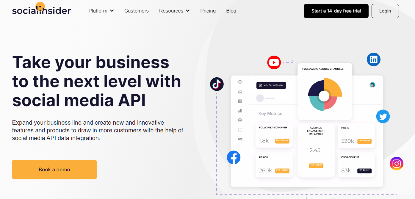 - Social Media Data Integration: Improve your business and create new products that cater to your audience’s needs with Socialinsider’s social media API data.