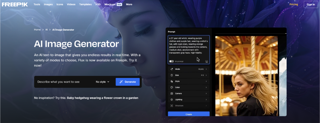 - Multiple AI Models: Choose from a range of AI models tailored to your project, including the efficient Flux Fast and Freepik’s flagship model, Mystic.