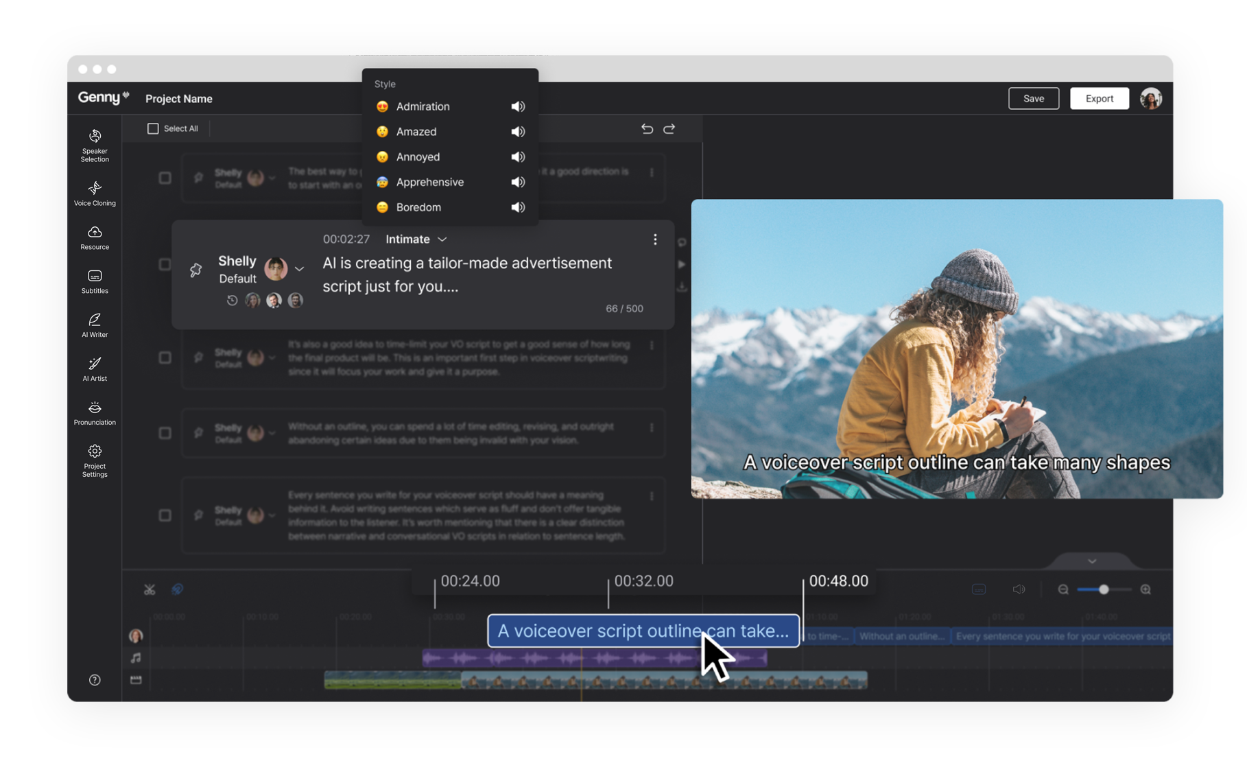 LOVO’s AI voice generator and video editor, Genny, is an all-in-one content creation platform built for marketing professionals and creators. With its suite of AI-powered editing tools, you can add realistic, human-like voices and perfect your marketing videos in minutes. Genny is an easy and intuitive platform that lets anyone produce high-quality video and audio content, from writing scripts to generating professional-grade voiceovers to adding engagement-boosting subtitles.