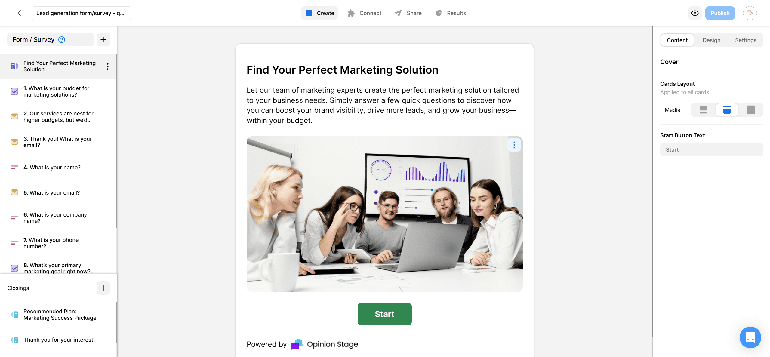 Shorter surveys get more responses. Keep the questions short, simple, and easy to understand. We recommend asking between 5-15 questions. The answers to the questions should cover all the options and shouldn’t overlap. If you only want to ask one question you can make an HTML poll in seconds.