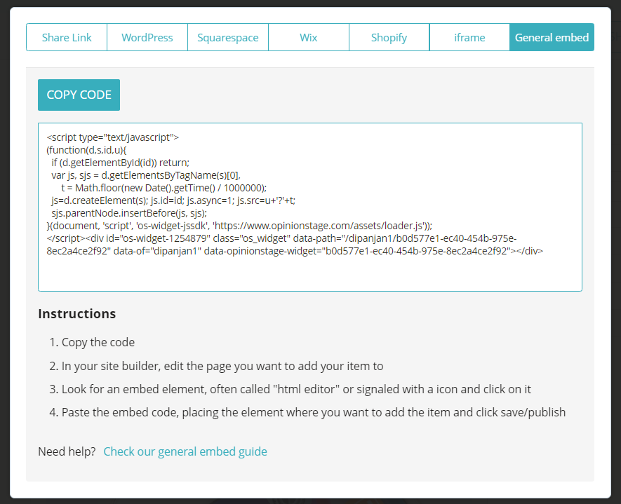 Go to your items dashboard and click ‘Share’ next to your quiz. Copy the URL to share your quiz via messaging apps or social media, or copy the embed code to embed it on your website. If you have a WordPress site, Opinion Stage also has a WordPress plugin that skips this step and embeds the quiz for you.