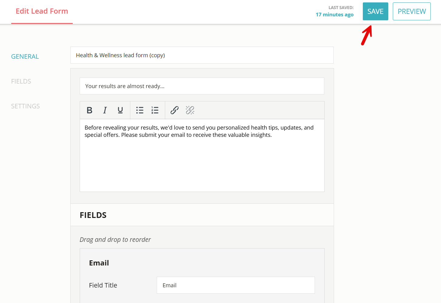 Fill in the lead generation form with the information you want to collect. Remember to keep it simple and ask only for what you need. Use friendly, clear language and explain how you’ll use their details. Don’t forget to let participants know they’ll receive their personalized results – or a reward like a coupon or discount – immediately after completing the form.