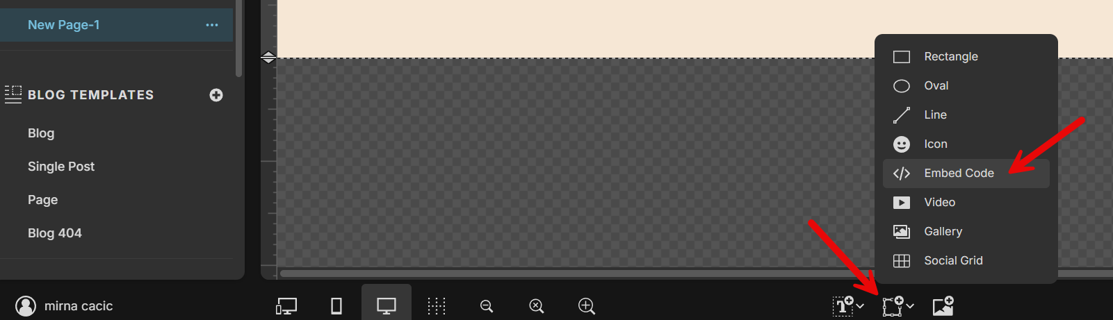 Click on your page to enable editing, then click on the picture frame icon at the bottom of your screen. Next, select Embed Code to continue.