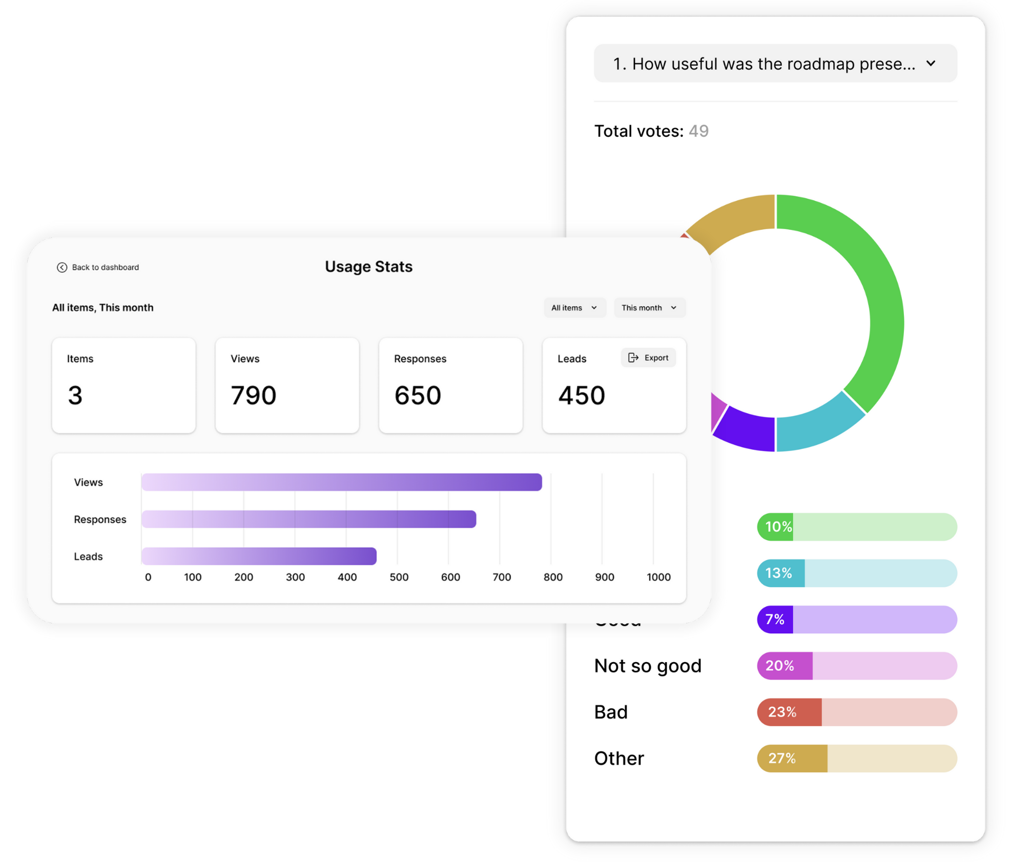 Get detailed visual reports about your poll responses, results, and performance in real time. You can export all this information to a CSV/XLS file for advanced analysis.