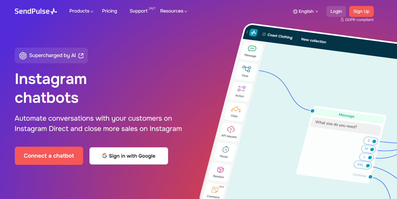 SendPulse’s Instagram chatbot automates conversations with your followers, improving engagement and customer service. It helps manage inquiries, book appointments, and sell products directly through Instagram messages. This tool integrates with ChatGPT and SendPulse’s marketing automation platform, allowing you to manage your communications across various channels with the help of advanced automation features.
