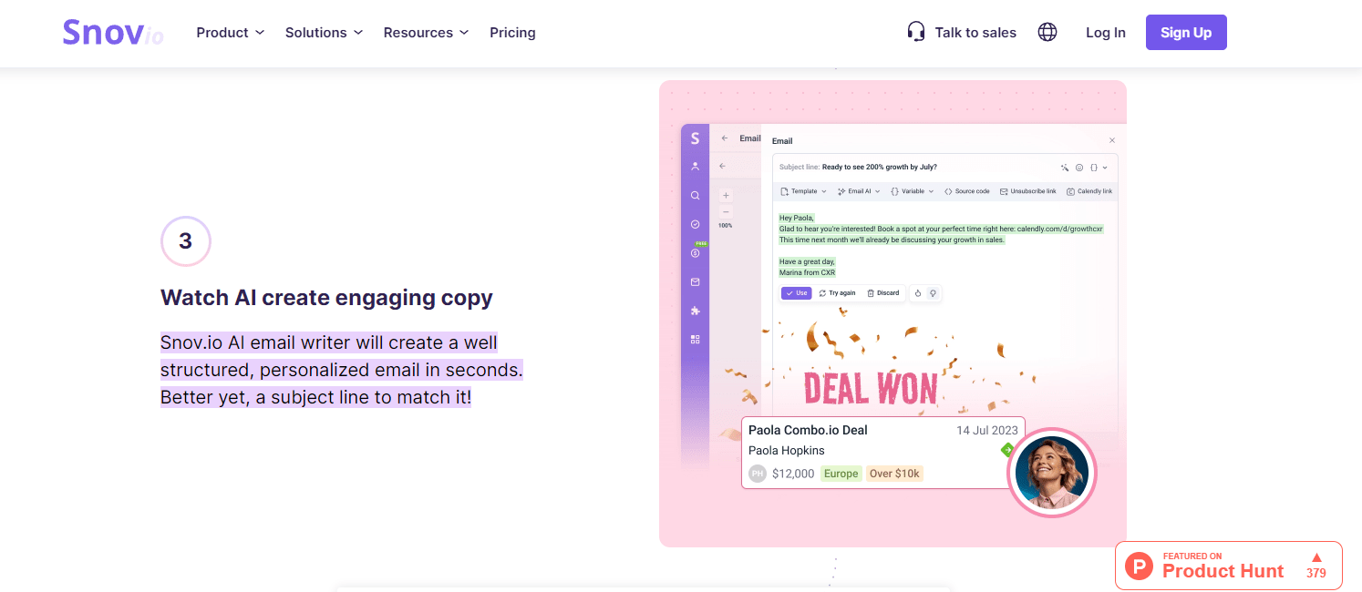 Snov.io’s Email AI writer is a great tool to add to your marketing toolkit. It empowers you with diverse pre-designed prompts, covering marketing emails, demo offers, and follow-ups. If you’re looking for more control, there’s also a custom prompt feature where you can unleash your creativity. It writes compelling, tailored emails that captivate recipients and stimulate replies. Within seconds, Snov.io’s AI generates structured, personalized emails complemented by impactful subject lines.