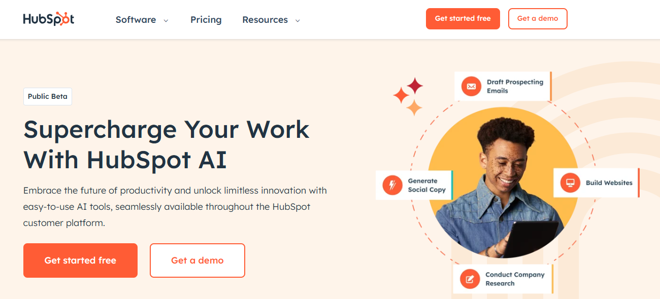 - Website Generator: Make complete one-page websites with just a few prompts. Use HubSpot’s drag-and-drop builder to further customize the output based on your needs.