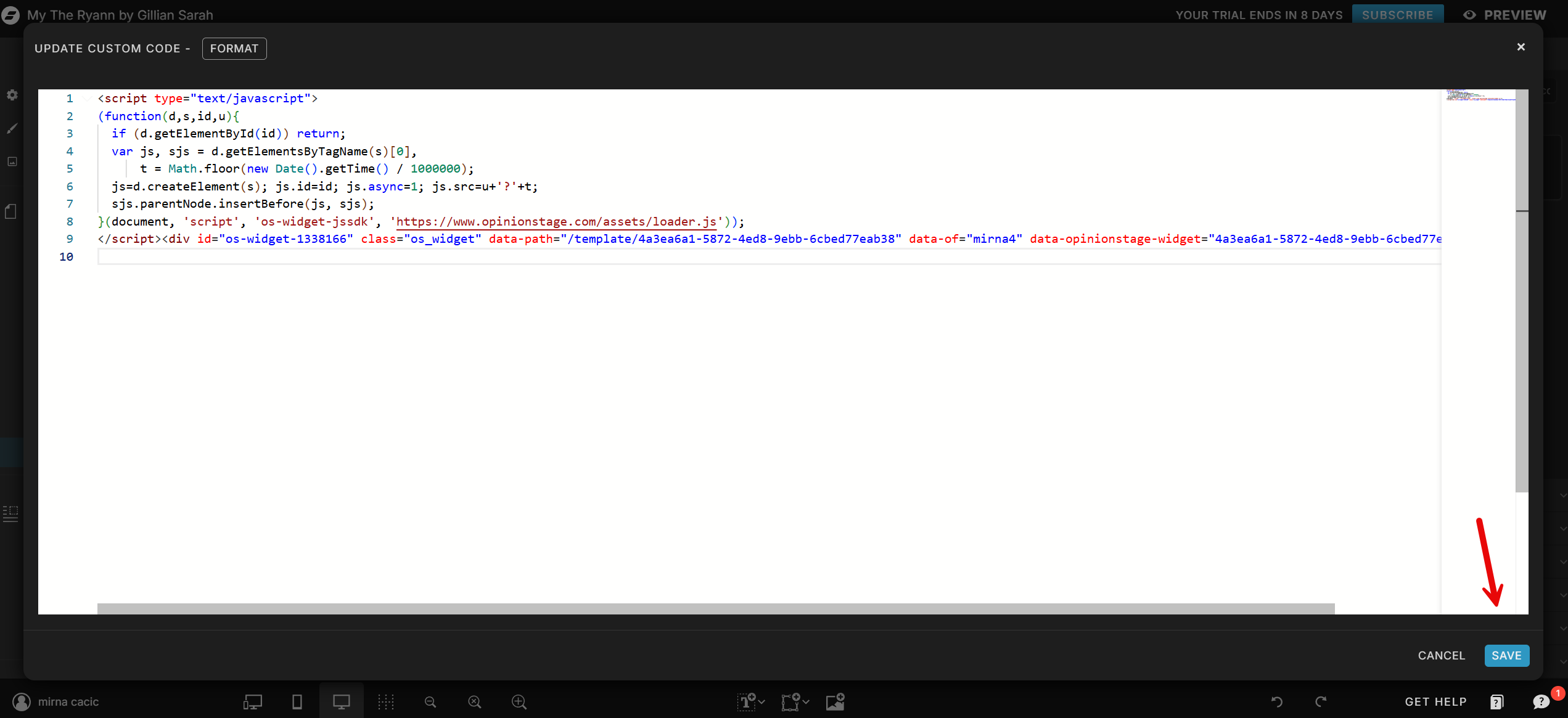 A white box will pop up on your screen. Paste your embed code here and click Save in the bottom right corner.